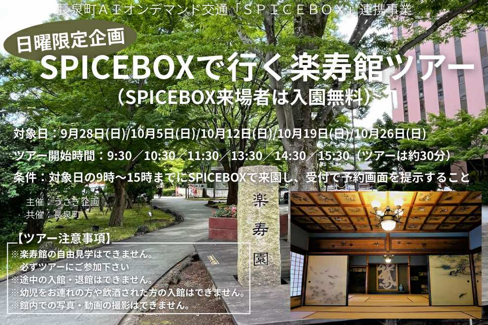 日曜限定の特別企画として、SPICEBOXにご来場いただいた方を対象に「楽寿館ツアー」を無料でご案内いたします。 明治時代の面影を今に伝える名建築・楽寿館を、専門ガイドとともに約30分で巡る特別な体験をお届けいたします。